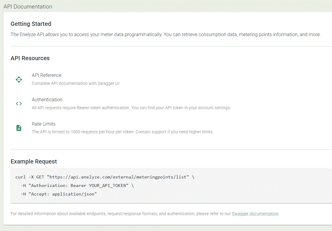 Skjermbilde av API-dokumentasjon for Enelyze API. Inneholder informasjon om API-ressurser som 'API Reference', 'Authentication' og 'Rate Limits'. Viser et eksempel på en curl-kommando for en API-forespørsel.